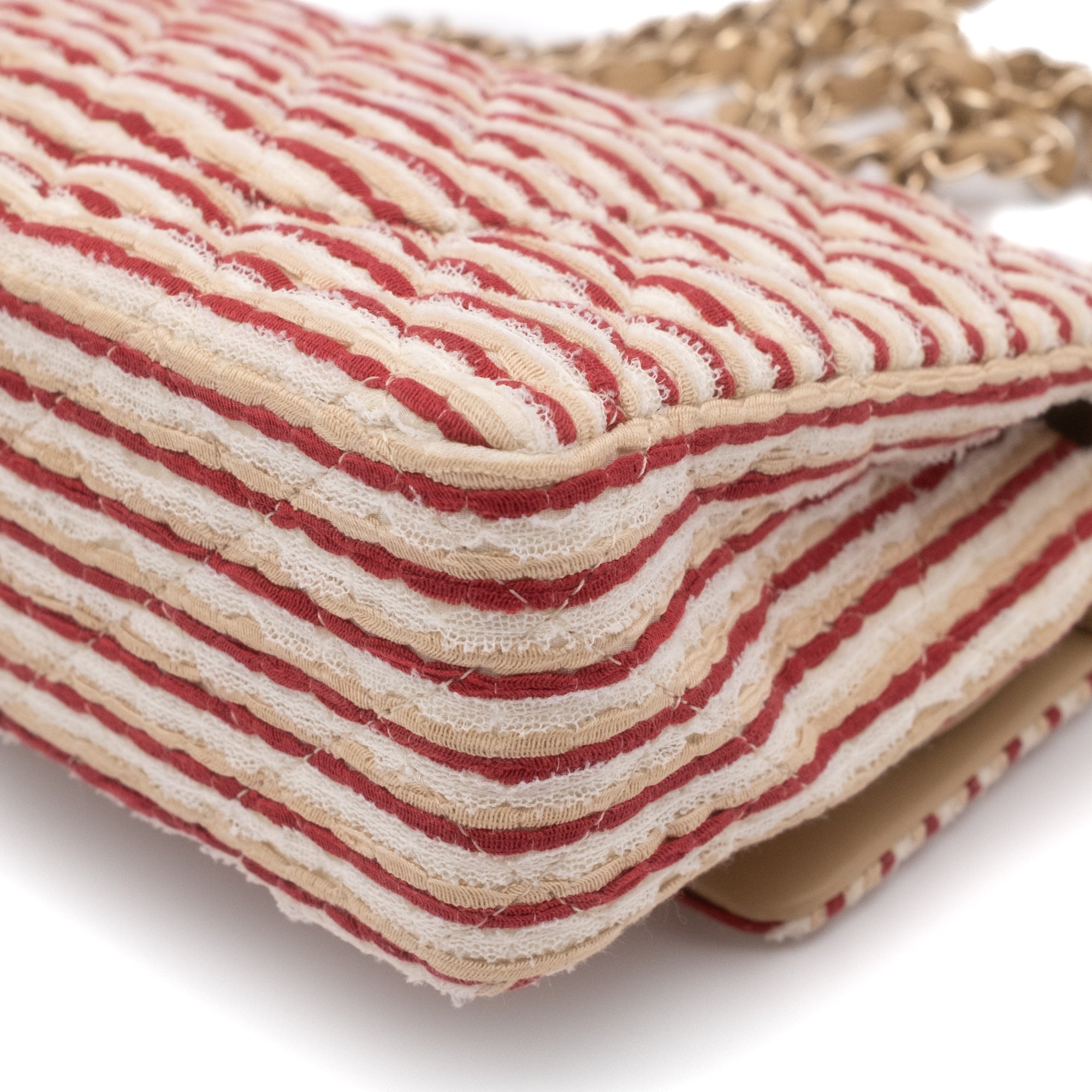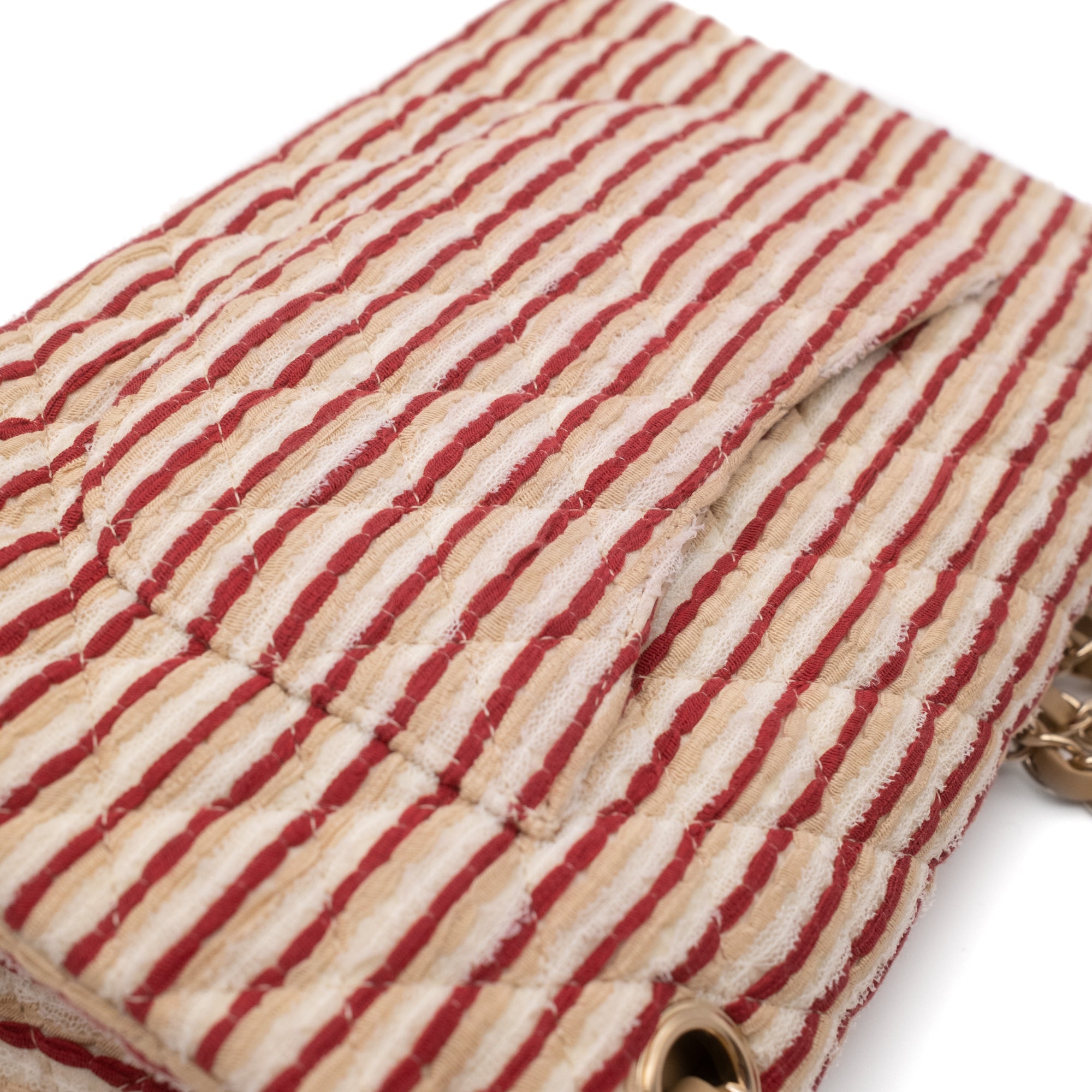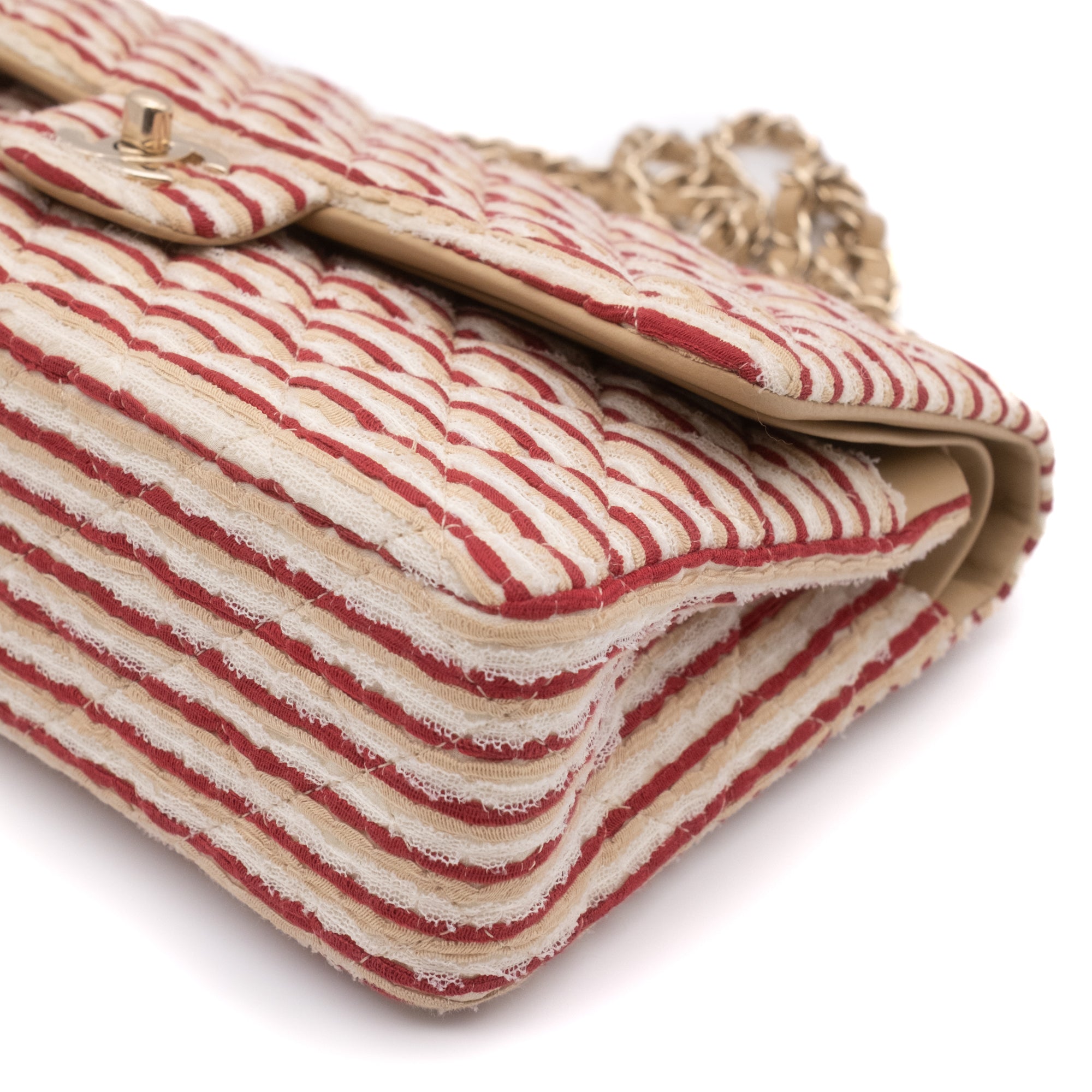 The Chanel Classic 11.12 Double Medium Flap Bag is Chanel's most popular and sought-after bag model. This limited-edition Chanel Coco Sailor special edition from the 2014 Cruise Collection is crafted from ivory and red striped canvas and silk with a double-braided chain, double front flaps with a CC lock, an additional detachable pearl strap, and gold-tone hardware. The bag comes with a Chanel box, Chanel dust bag, and Chanel ID authenticity card.